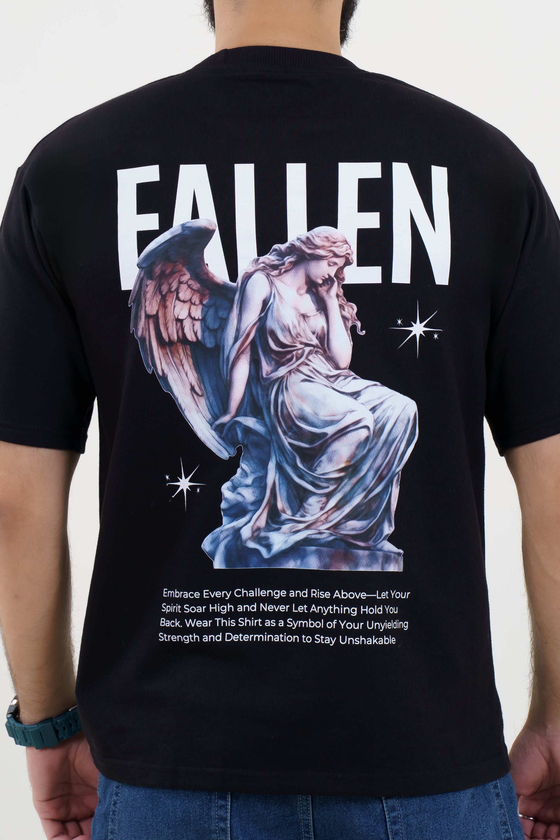 - Back Graphic: Fallen Angel with “FALLEN” typography and motivational quote